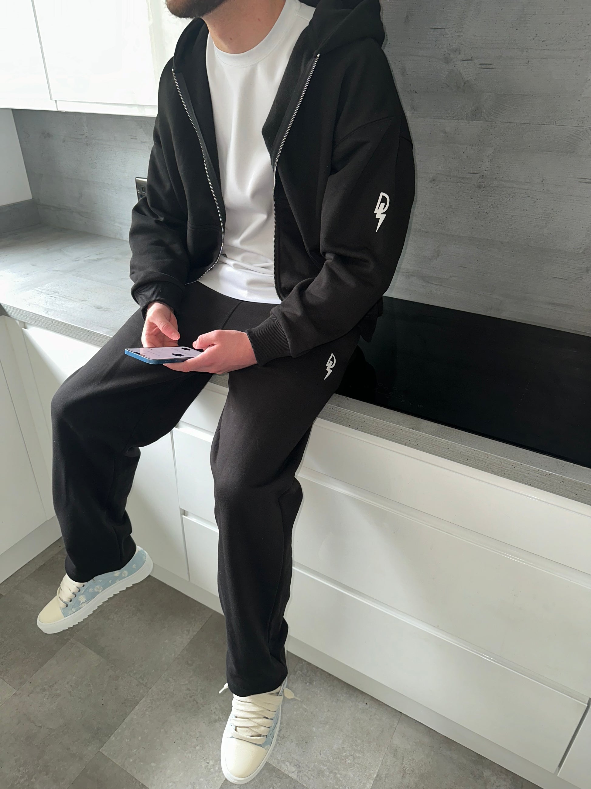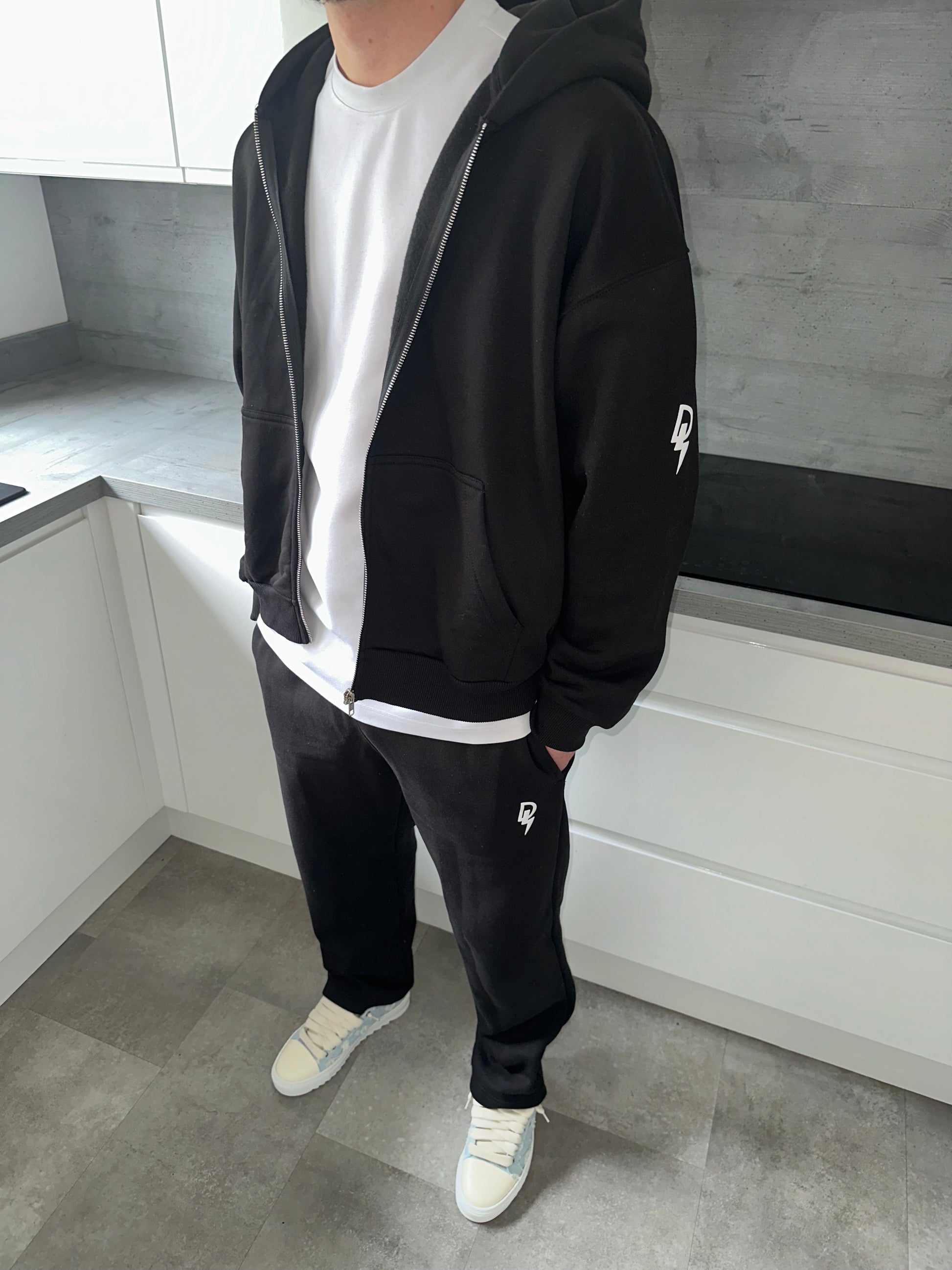 Crafted using a premium cotton material. The hoodie is a boxy fit with a dropped shoulder finished with our logo printed on the left arm. The joggers are straight legged, also crafted with the same material and finished with our logo printed on the left leg.